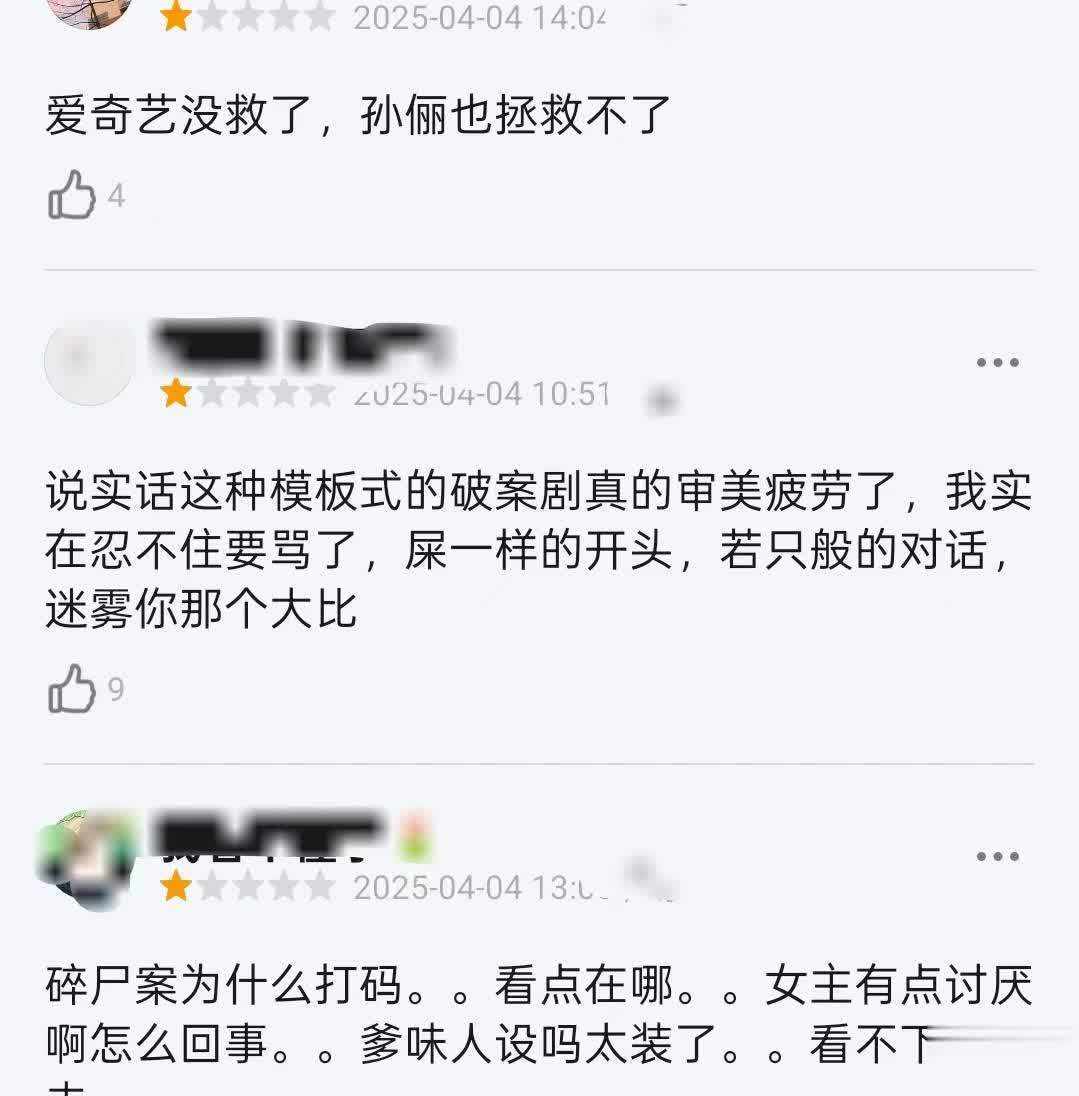说实话,刚开始追剧的时候,我被剧中精良的制作吸引住了,但随着剧情的发展,我的热情逐渐降温。很多剧情细节,简直让人无语: 超大的马赛克,让人感觉是在看“像素风”侦探片;实习生的反应,迟钝得让人着急,仿佛在演一出慢动作电影;韩青随身携带的止痛药,用词也过于随意,感觉这细节处理得有些不走心。更别说那让人无力吐槽的恋爱脑女主和脾气暴躁的领导,还有各种不符合常理的实习生行为设定,这一个个的bug,简直让人怀疑人生!难道悬疑剧就只能靠这些漏洞来撑场面吗?最重要的是,这部剧本应该有的悬疑感,却像被抽空了一样,毫无紧张感可言,整体感觉更像一部披着悬疑剧外衣的偶像剧,实在让人失望。 难怪很多观众都纷纷弃剧,只留下少数忠实粉丝,苦苦支撑。